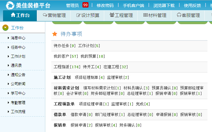 美佳裝飾管理軟件 為提高裝飾裝修公司員工工作效率,系統(tǒng)優(yōu)化主頁【待辦事項】功能,優(yōu)化后的【待辦事項】可快速查看個人需要審核的相關(guān)工作流程單據(jù)。